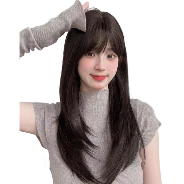 ふかし加工をして、前髪のふわふわ感を高めるだけでなく、小さな顔の効果も実現できるロングストレート黒髪ウィッグです。