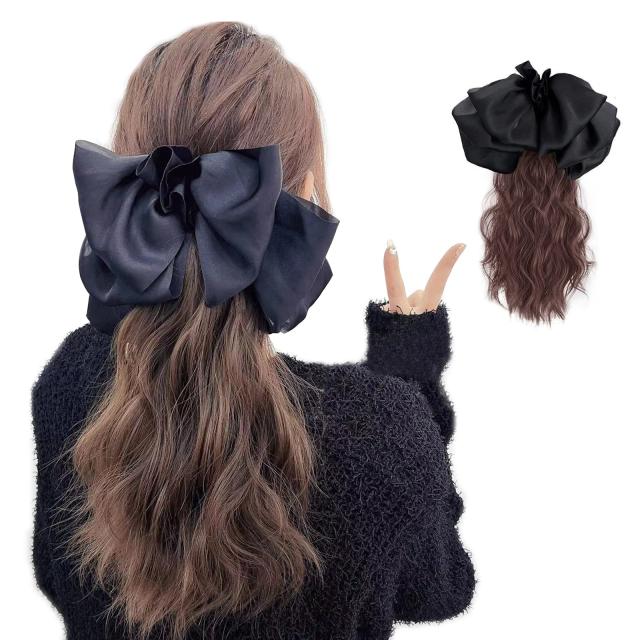 30cm ブラック_ブラック レディース 蝶結び クリップ式 ポニーテールウィッグ ハーフウィッグ カール 部分ウィッグ ヘアエクステ 巻き髪 耐熱 つけ毛 (30cm ブラック, ブラック)