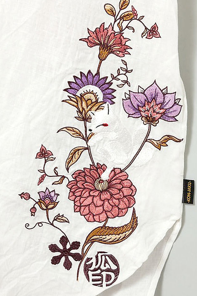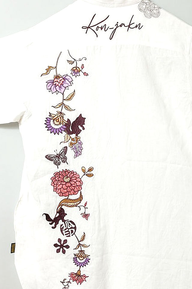 愛らしい狐のキャラクターが主役の【今昔】から「和風ペイズリー」総刺繍ロング丈シャツ(KJ-29215)のご紹介です。 今昔から人気のロング丈シャツが登場しました。 今回はペイズリーを和柄調に表現し、フロントバックにバランス良く配置しました。 花に隠れるように狐が隠れているところがポイントです。 着こなしに幅を持たせてくれること間違いなしのアイテムに仕上がっています。 贅沢な総刺繍で、存在感のある一枚です。 ボタンはシャツの世界観に合わせたシンプルなものを採用。 左胸、両身頃にはポケットが縫い付けられています。 | ||||||||||||||||||||