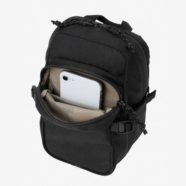 フロントにはパッド入りのスリーブを内蔵し、ガジェットの収納が可能。本体内部はスリットポケットを設けたシンプルな構造で、自立するボックス型にデザイン。内部へのアクセスと収納物の出し入れをスムーズに行えます。