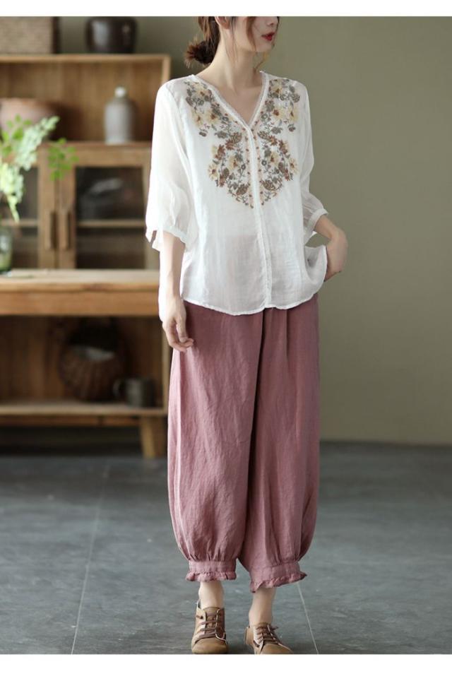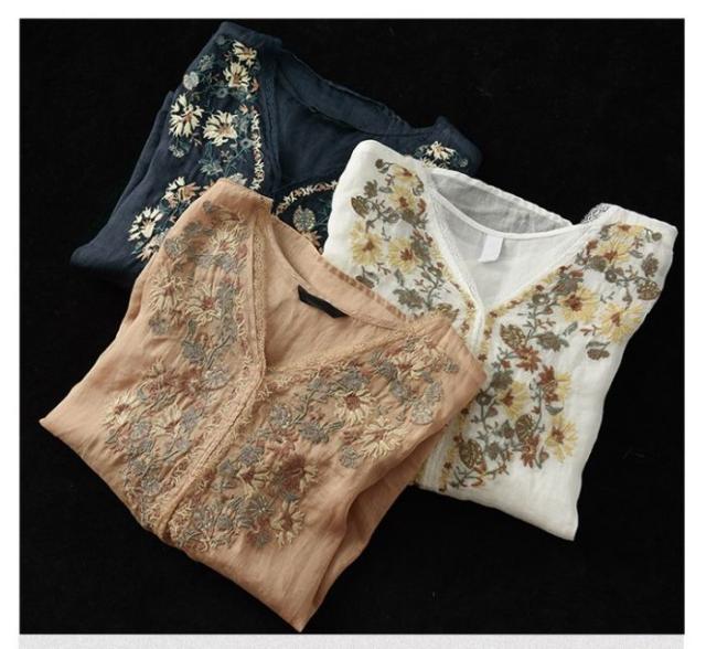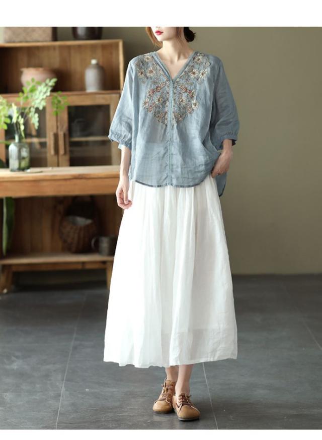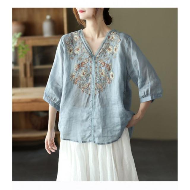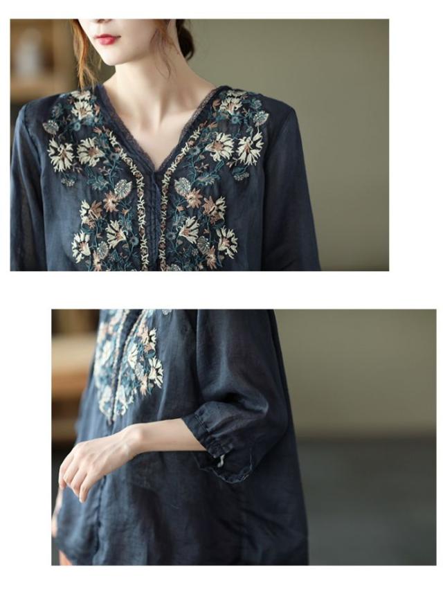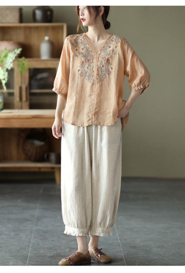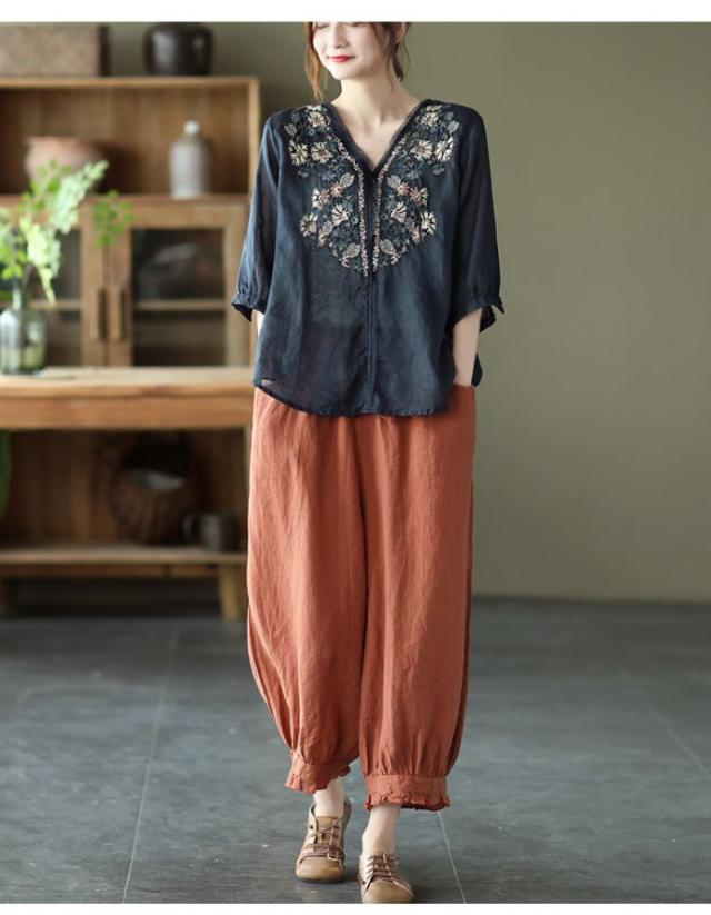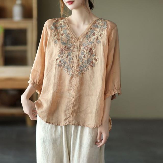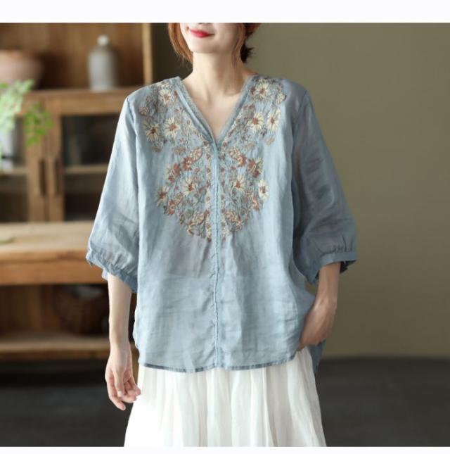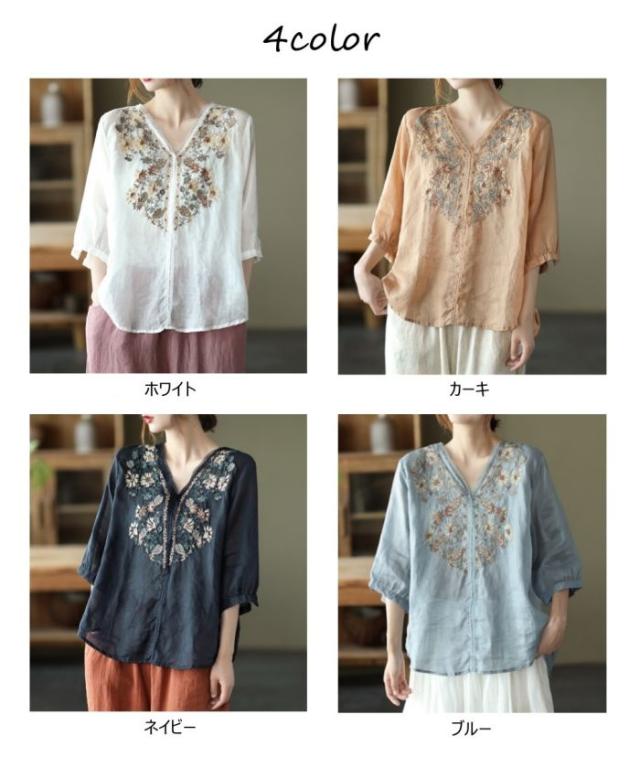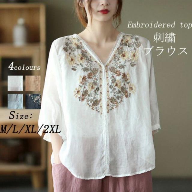 ブラウス レース 刺繍 半袖 Tシャツ 夏 刺繍ブラウス リネンシャツ 麻 トップス チュニック レディース 半袖シャツ tシャツ シャツブラウス vネック 綿シャツ 花柄 刺繍シャツ 5分袖 体型カバー ゆったり 大きいサイズ カジュアル おしゃれ 涼しい 通気性 通勤