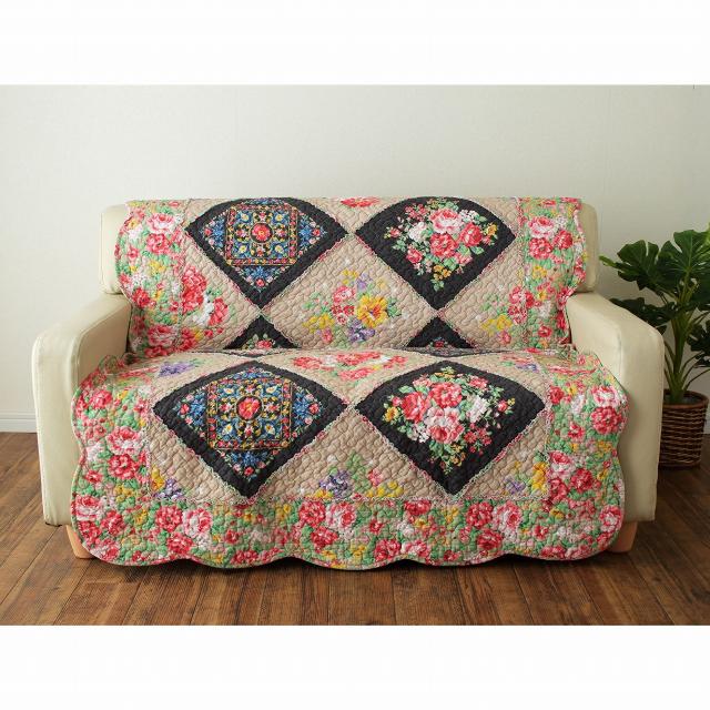 パッチワークの中掛けソファカバー ブラックブーケ 2人掛用 100×160