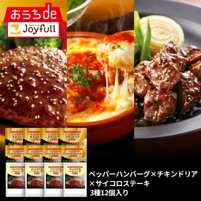 ジョイフル 人気商品セット3種12個入り(ペッパーハンバーグ×サイコロステーキ×チキンドリア) おかず 冷凍 おかずセット 総菜セット 冷凍食品 詰め合わせ お惣菜セット