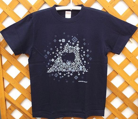 津軽塗の模様を22種類並べて弘前城・桜・岩木山のシルエットイラストがデザインされているTシャツです。
