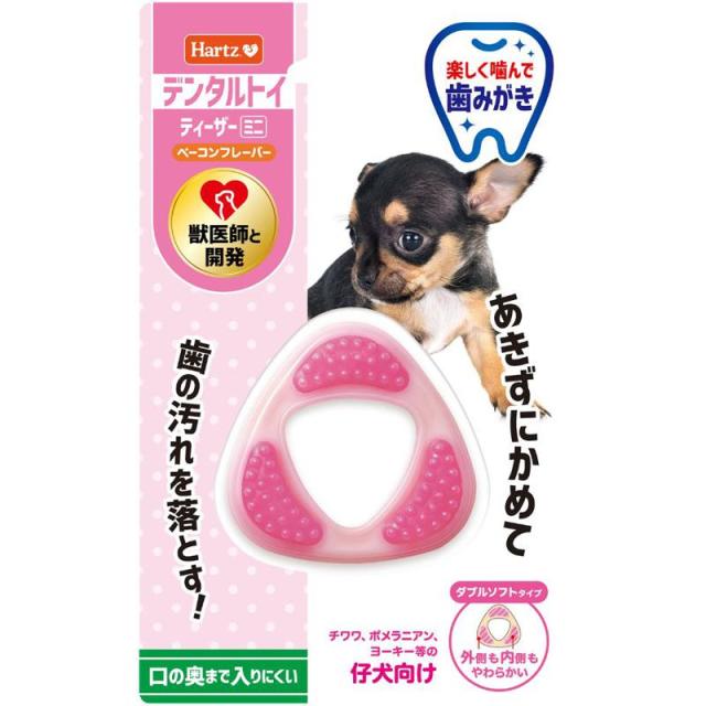 あきずにかめて歯の汚れを落とす!。愛犬が噛んで遊ぶおもちゃです。よく噛むことは歯と歯ぐきを清潔に保ち、お口の健康を維持することに役立ちます。口の奥まで入りにくい形状のデンタルトイ。チワワ、ポメラニアン、ヨーキー等の仔犬向け。内側のポツポツ部分と外側のフレーム部分もやわらかいダブルソフトタイプ。おいしいベーコンフレーバー付き。
