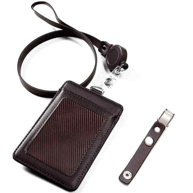 [Viaky] ネームホルダー id カードホルダー レザー 縦型パスケース 伸縮リール式 ネックストラップ バンドクリップ 付き ユニセックス ポケット三つ 社員証 名札 定期入れ ケース (パスケース 縦型 ブラウン)