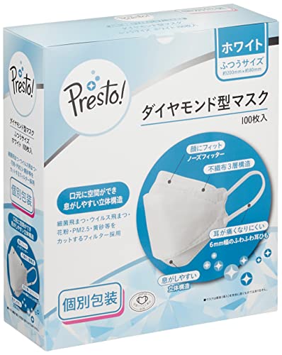 ブランド Presto! ダイヤモンド型 マスク ふつうサイズ ホワイト 100枚 個別包装 マスク工業会会員 JIS規格適合 立体型 無地
