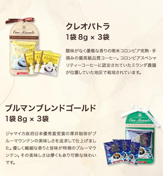 | 内容量 | 下記から1種類お選びください ・エーデルワイス 8g×3袋 ・クイーンシバ 8g×3袋 ・クレオパトラ 8g×3袋 ・ブルマンブレンドゴールド 8g×3袋 ・やくもブレンド 8g×3袋 ・ブレンドハーモニー 8g×3袋 |