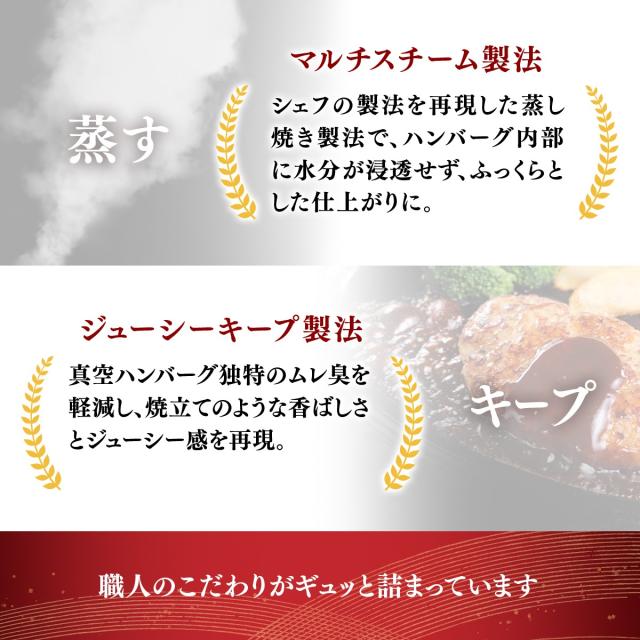 今回ご紹介するハンバーグは、旨味を閉じ込める「ダブルベルトグリル製法」、シェフの製法を再現する「マルチスチーム製法」、焼きたての香ばしさとジューシーさを再現する「ジューシーキープ製法」の、職人のこだわり3製法がギュッと詰まっています。
