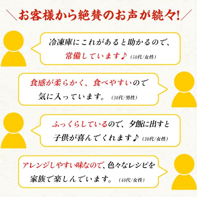 - レンジ又は湯煎でいいので、とても便利でした。又とても大きくて美味しかったです。今度は和風ソースを作って、食べてみようと思います。