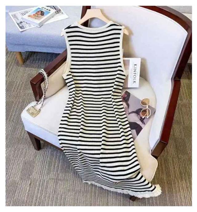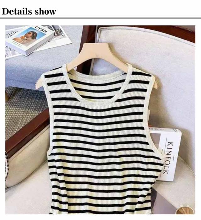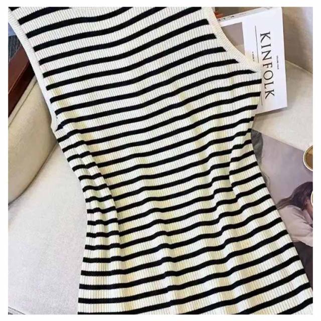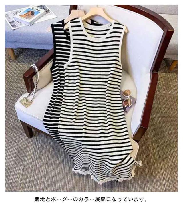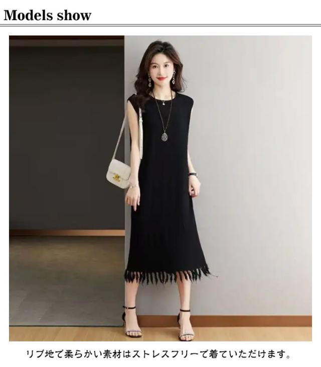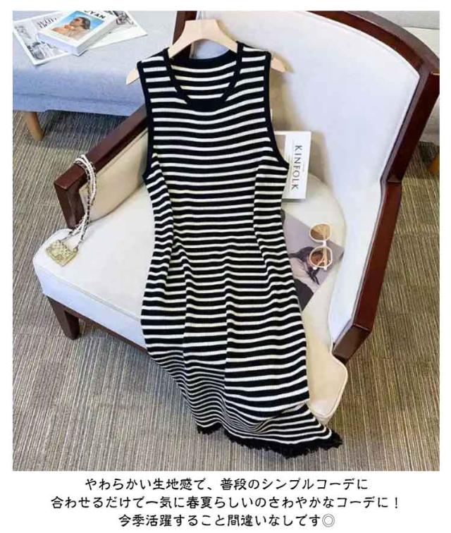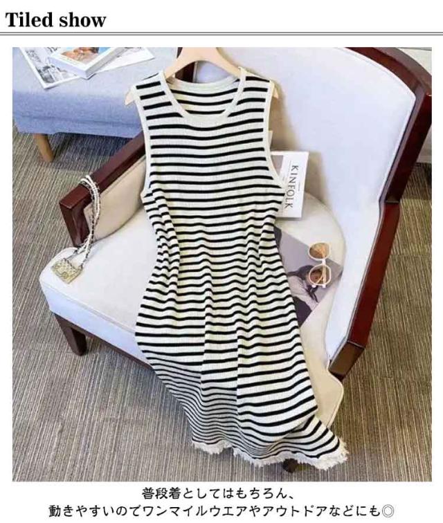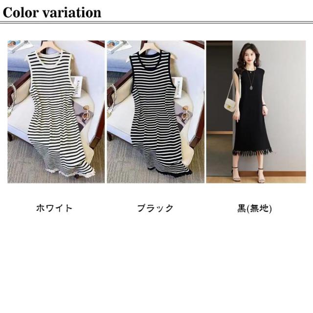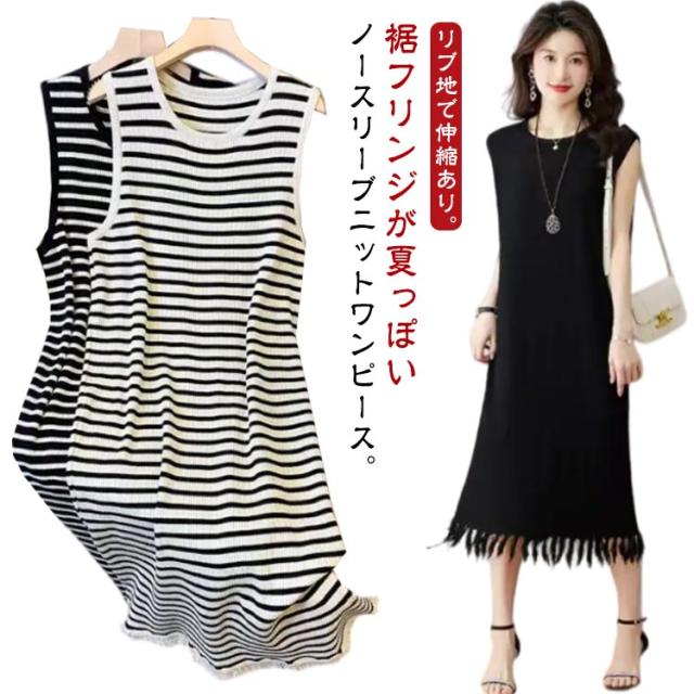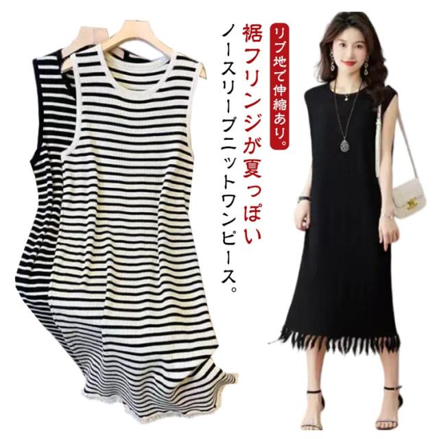 ノースリーブワンピース 夏 ニットワンピース 接触冷感 レディース サマーニット ロングワンピース ボーダー柄 タッセル 裾フリンジ 大人かわいい 薄手 ニット ワンピース ロング丈 袖なし ゆったり ストレッチ 体型カバー ルームウェア 【送料無料】