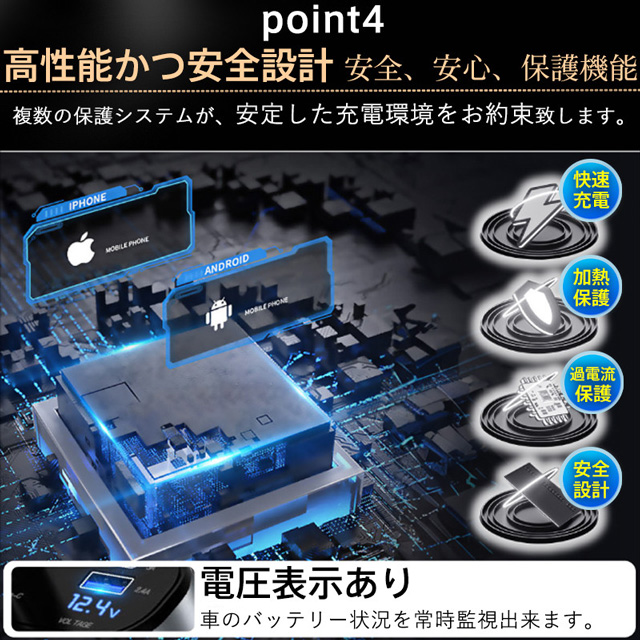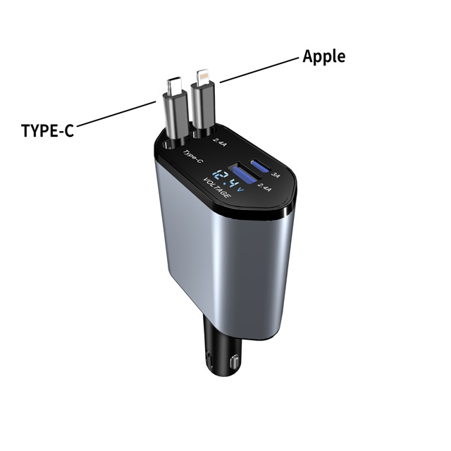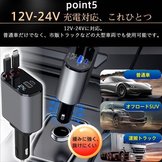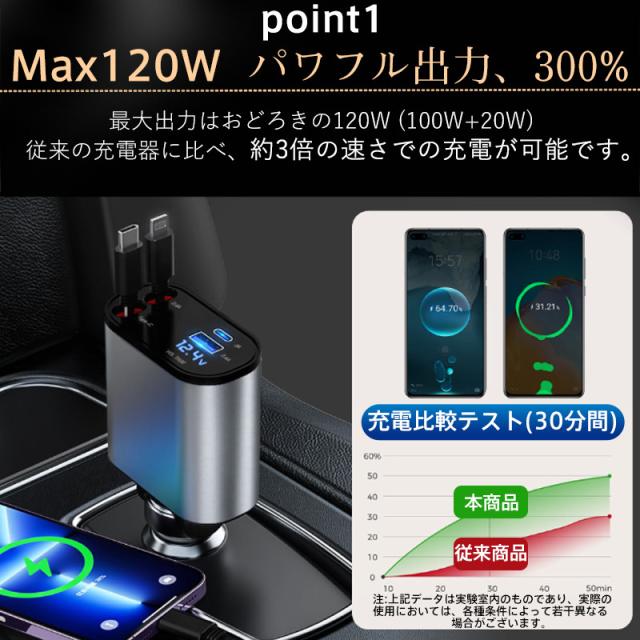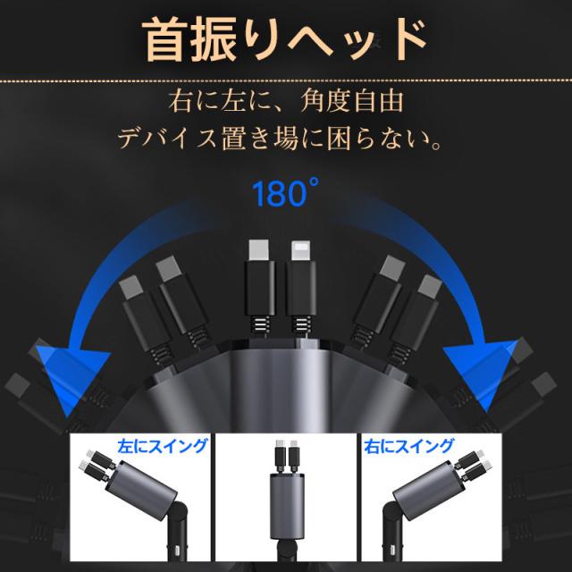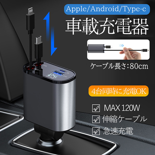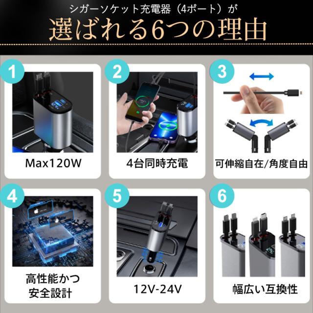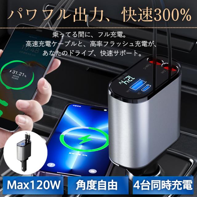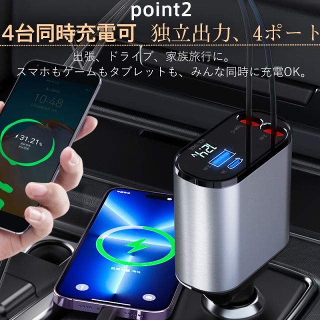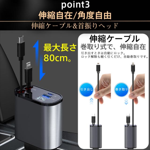 急速充電 シガーソケット 充電器 カーチャージャー 巻き取り 車載充電器 リール式 車 USB Type-C iPhone 巻き取り式ケーブル2本付き 4ポート 4台同時に充電 iPhone 巻き取り式 12V車 24V車 Apple Android シガーチャージャー USBポート付 リールタイプ 後部座席