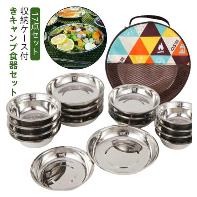 】 皿セット 食器セット プレート アウトドア 食器 収納ケース付き 【17点セット ステンレス ボウル 皿 セット テーブルウェア 食器皿 キャンプ おしゃれ コンパクト 収納 バッグ テーブルウェアセット バーベキュー BQQ 山 川