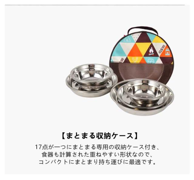 】 セット 食器セット 【17点セット 【17点セット コンパクト ボウル 皿 ステンレス 収納ケース付き アウトドア 食器 プレート 食器皿 テーブルウェア おしゃれ 皿セット 収納 バッグ テーブルウェアセット バーベキュー BQQ 山 川