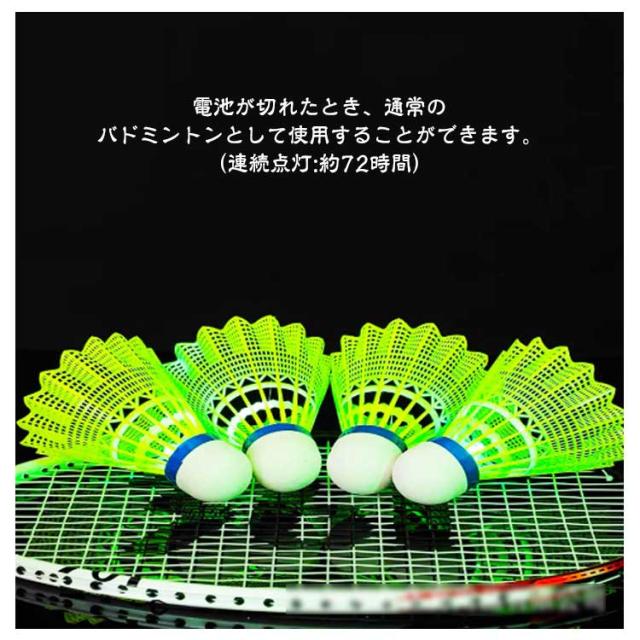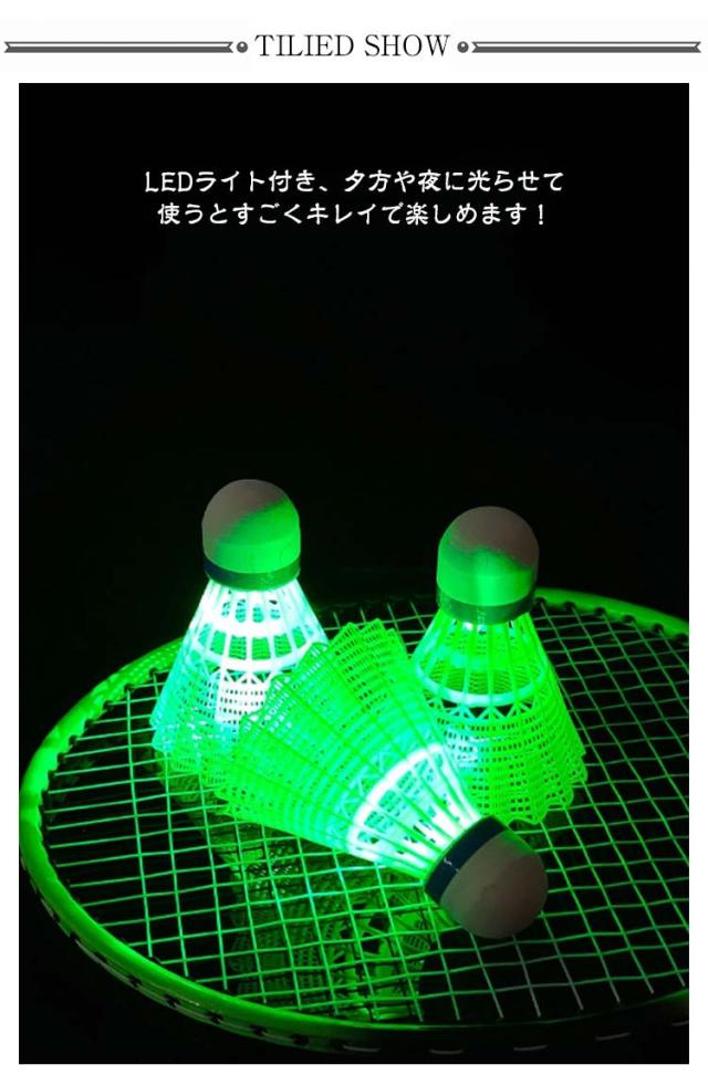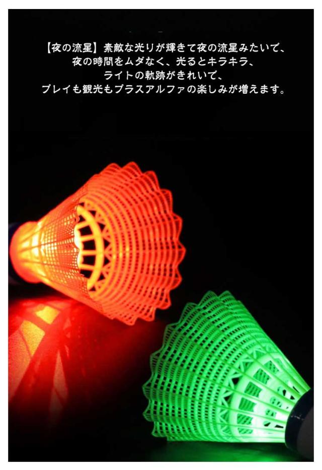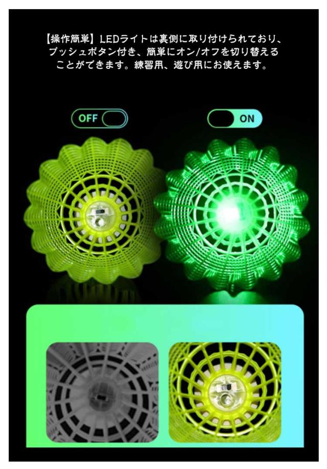 | 【光るシャトル】 【5個入り】【軽量】 LEDライト付き、夕方や夜に光らせて使うとすごくキレイで楽しめます! 電池が切れたとき、通常のバドミントンとして使用することができます。 (連続点灯:約72時間) 【操作簡単】LEDライトは裏側に取り付けられており、プッシュボタン付き、簡単にオン/オフを切り替えることができます。練習用、遊び用にお使えます。 軽量設計なので持ち運びが簡単なので、いつでもどこでも妥協することなくトレーニングできます。 【夜の流星】素敵な光りが輝きて夜の流星みたいで、夜の時間をムダなく、光るとキラキラ、ライトの軌跡がきれいで、プレイも観光もプラスアルファの楽しみが増えます。 【ストレス解消】昼のように訓練みたい 元気いっぱい、ストレス解消、家族と友達と夜のスポーツを楽しんでいる。 | |