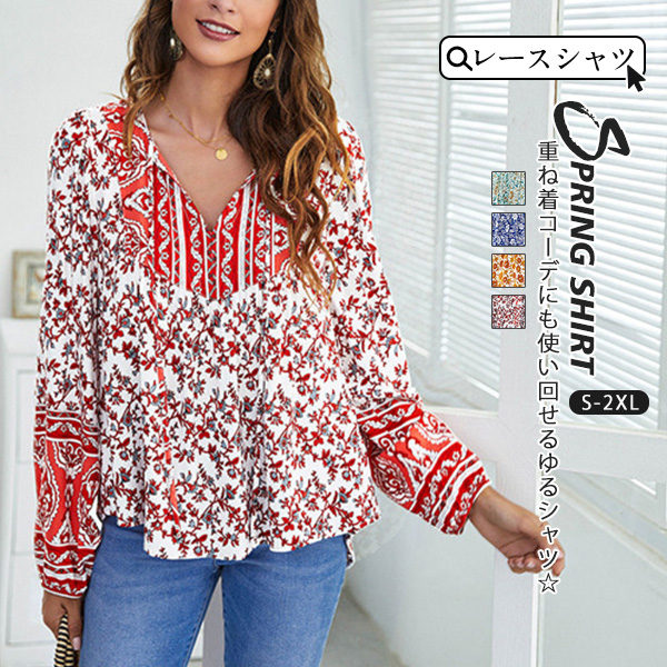 レースシャツ ブラウス シャツ インナー Vネック きれいめ ゆったり 長袖 ボリューム袖 レディース シンプル 大人 春