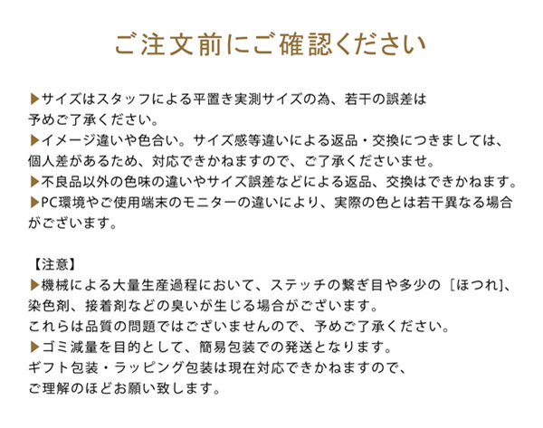 ※商品は縫製上の細かいほつれ、汚れ、素材特有の臭いや接着剤等の臭いが残っている場合がございますので、気になるお客様はご購入をお控え下さい。