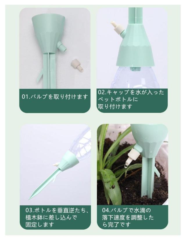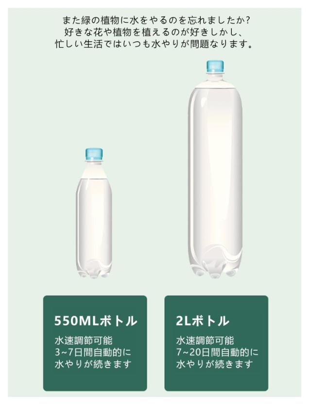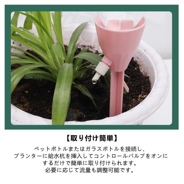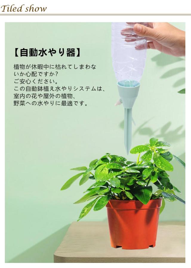 | 工事不要・無段階速度調節・均一な放水 留守番の植物や野菜の水やりはお任せ! 自動水やり器 【同色/異色24個セット】 ペットボトルで自動給水器に! 忙しい毎日の生活や旅行での水やりに最適な商品です。 ネジの調整で水滴の速度を調整できます。 もう困らない!外出中の水やり簡単! 留守中だけでなく、水が乾きやすい時期の水やり用としても夏場など外でこまめに水を上げるのが大変な時にも役立ちます。 <お勧めポイント> 【自動水やり器】 植物が休暇中に枯れてしまわないか心配ですか? ご安心ください。この自動鉢植え水やりシステムは、室内の花や屋外の植物、野菜への水やりに最適です。 水量調節 - このシステムでは点滴バルブを使用して流量を調整し、過剰な水やりを防止し、異なる植物や花に合わせた適切な水量を提供します。 【アップグレード設計】 最新の植物給水器は一定の圧力と安定した水流で設計されています。ホコリや虫による目詰まりも防ぐため、ホコリ防止密閉式接続口が採用されています。 【取り付け簡単】 ペットボトルまたはガラスボトルを接続し、プランターに給水杭を挿入してコントロールバルブをオンにするだけで簡単に取り付けられます。必要に応じて流量も調整可能です。 【ほとんどのペットボトル対応 】 直径25mm〜30mmの逆挿入口設計で、水圧に影響されず、水滴が垂れることもありませんので、ペットボトルに穴を開ける必要はありません。 | |