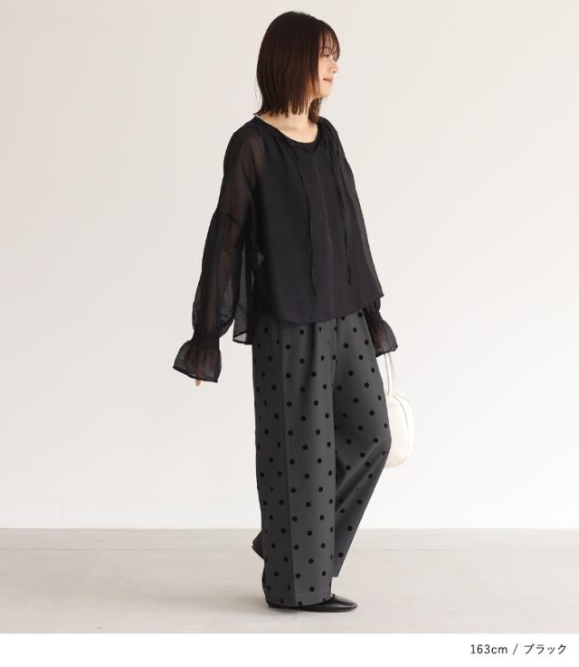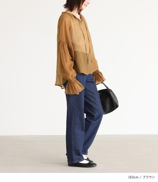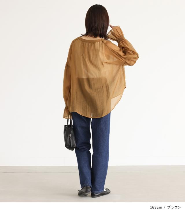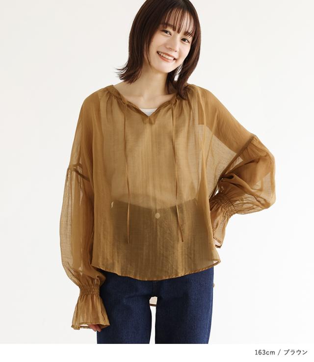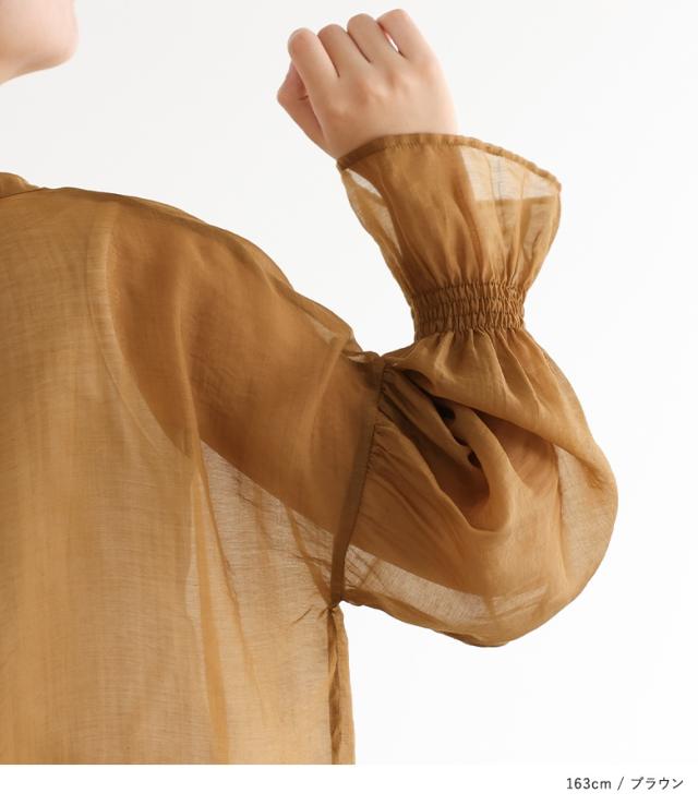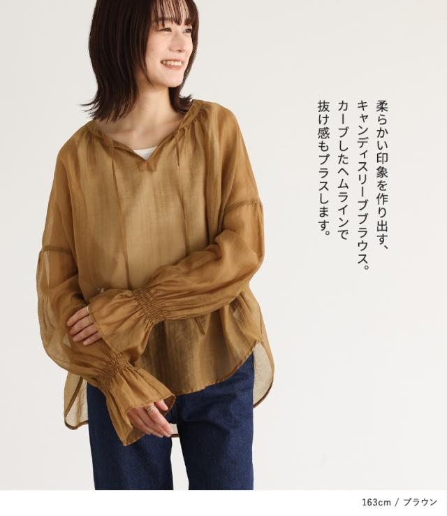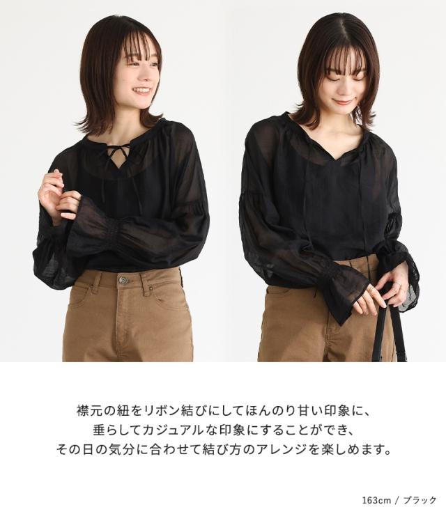 『キャンディスリーブシアーブラウス』※メール便可※【5】ブラウス シアー レディース トップス 長袖 シアーシャツ チュニック バンドカラー キャンディースリーブ シースルー ドロップショルダー しわ加工 リボン きれいめ 大きいサイズ
