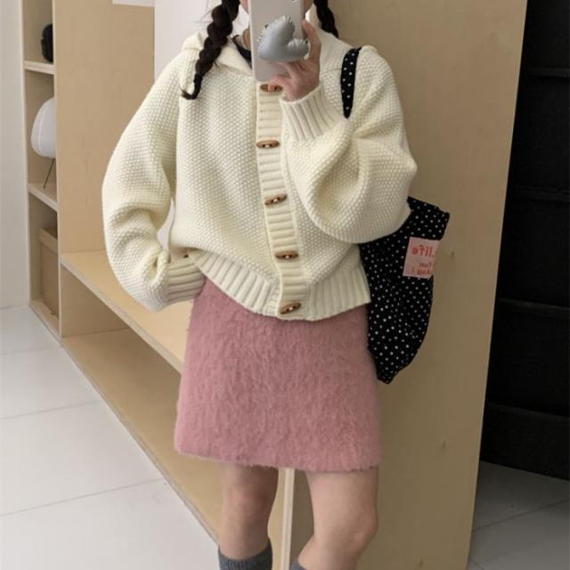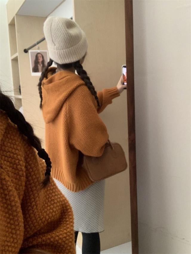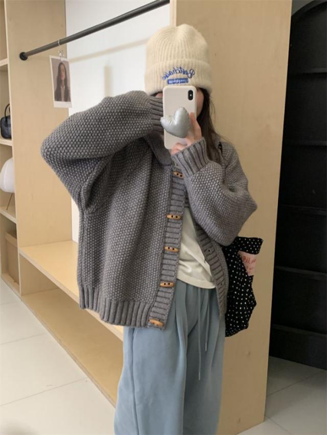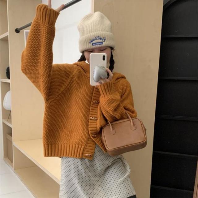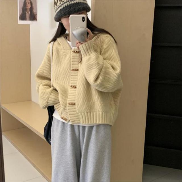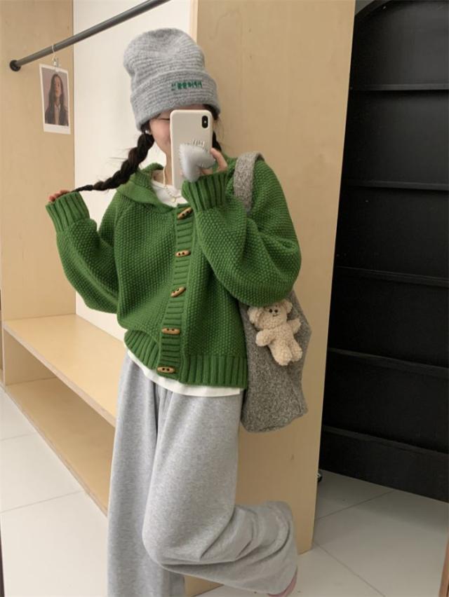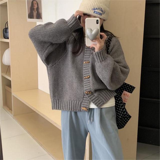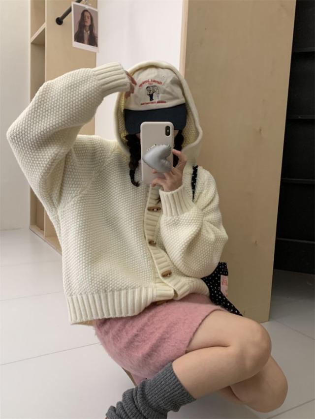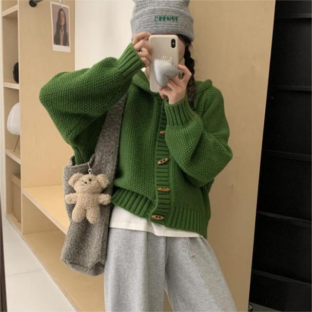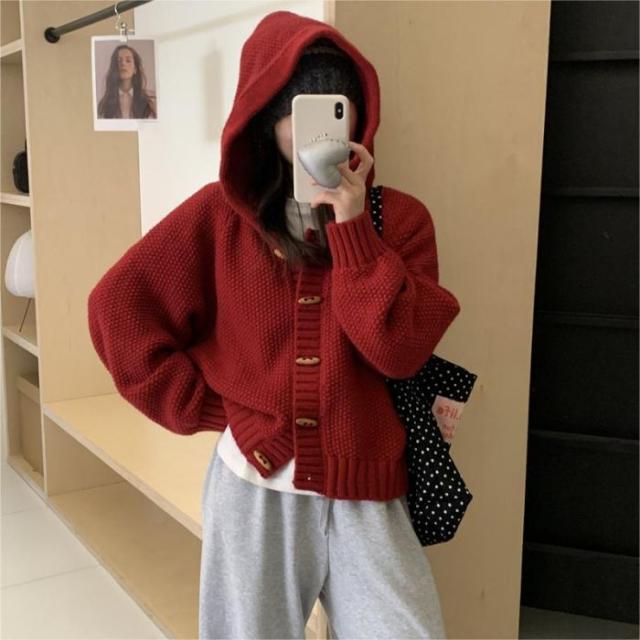 角ボタンフードニットカーディガンジャケットレディース秋冬新作怠惰風ゆったり無地お洒落カジュアルトップス