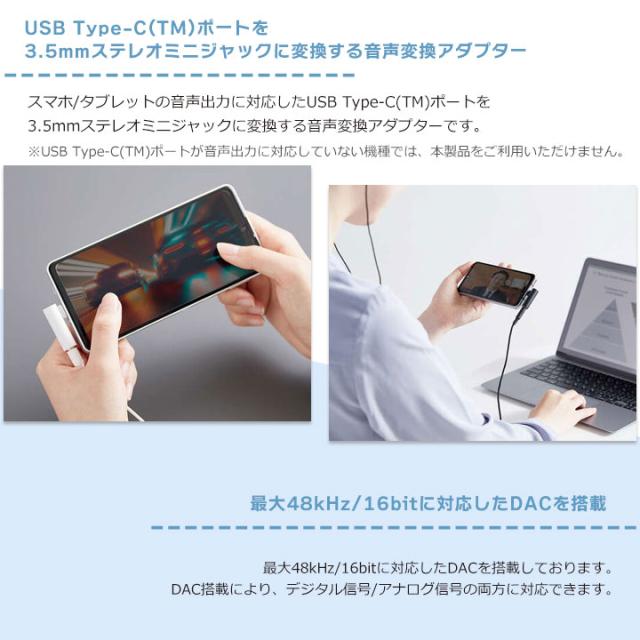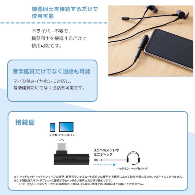 | 対応機種 | USB Type-C(TM)ポートからの音声出力に対応したスマートフォンおよびタブレット(端末からの出力は、アナログ・デジタル両対応) |