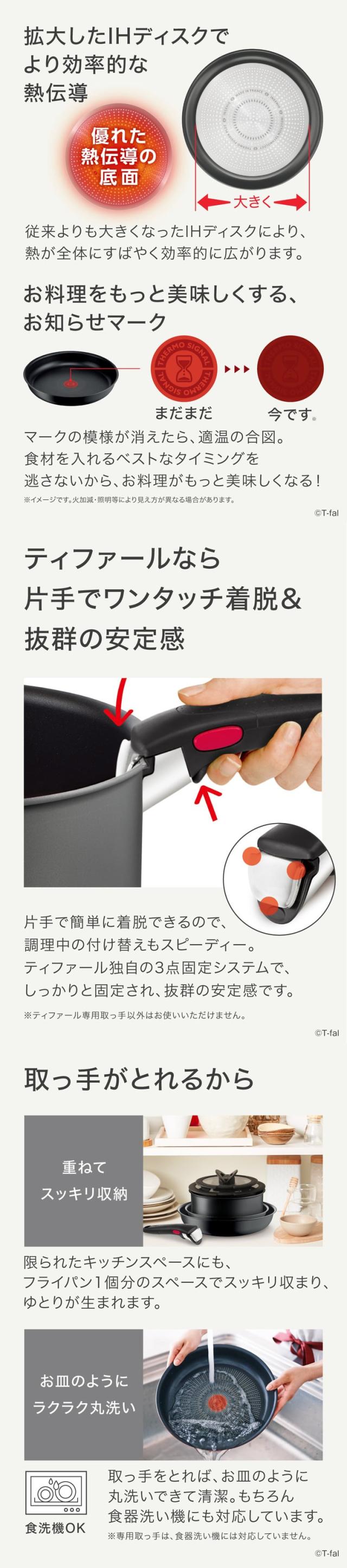 ティファール独自の3点固定システムで抜群の安定感があります。片手で着脱できるので付け替えもスムーズ。取っ手はインジニオシリーズ全てに対応しているので、買い替えや買い増しも安心です。