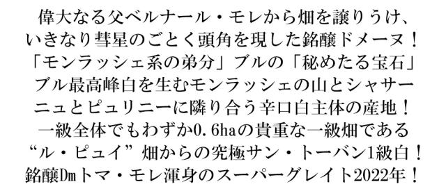 偉大なる父ベルナール・モレから畑を譲りうけ、 いきなり彗星のごとく頭角を現した銘醸ドメーヌ! 「モンラッシェ系の弟分」ブルの「秘めたる宝石」 ブル最高峰白を生むモンラッシェの山とシャサー ニュとピュリニーに隣り合う辛口白主体の産地! 一級全体でもわずか0.6haの貴重な一級畑である “ル・ピュイ”畑からの究極サン・トーバン1級白! 銘醸Dmトマ・モレ渾身のスーパーグレイト2022年!