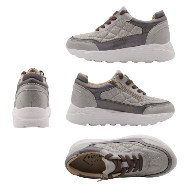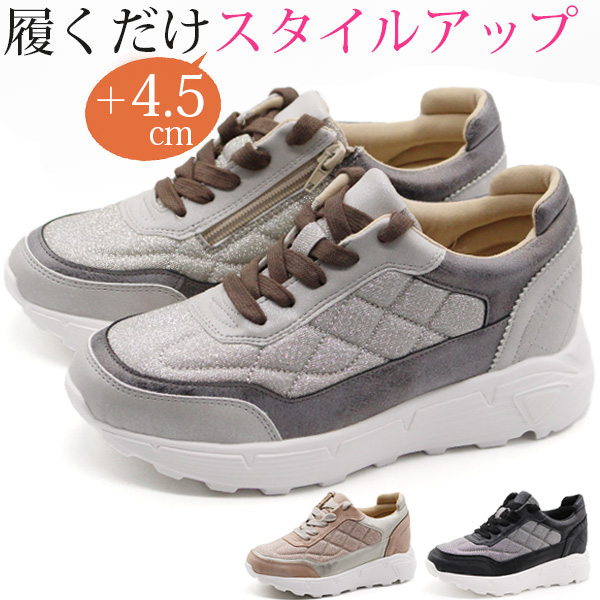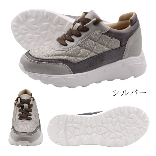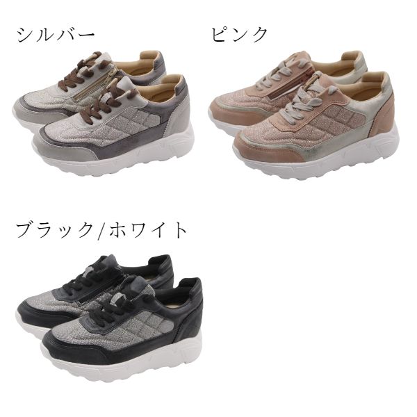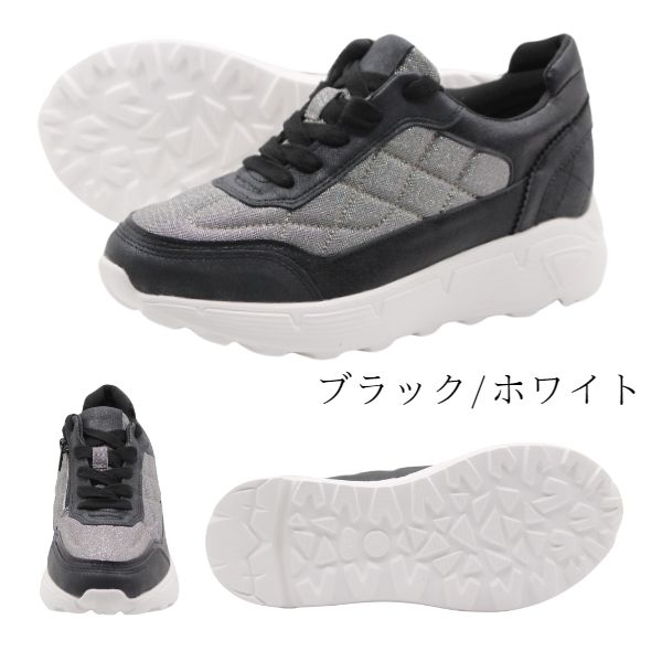 スニーカー レディース 靴 シルバー ブラック 銀 黒 キラキラ 通勤 お出かけ コーデ クッション性 厚底 スタイルアップ 4.5cm インヒール シークレットソール シークレットヒール サイドジップ ファスナー 歩きやすい PARTAM LUXE 17070