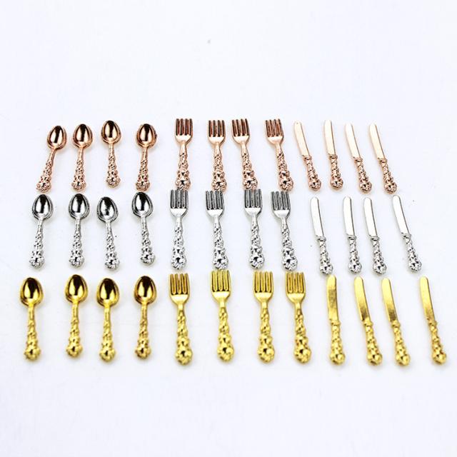 ミニチュアカトラリーセット 12点セット 3色 手のひらサイズの食器セット ミニチュアダイニングセット ミニチュアキッチンウェア リアルなミニチュアカトラリー