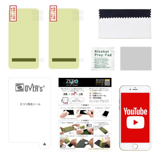 ZEROフィルム 2枚、魔法のシール 2枚、アルコールパット 1個、クリーニングクロス 1枚、ホコリ取りシール 1枚、日本語説明書 1枚