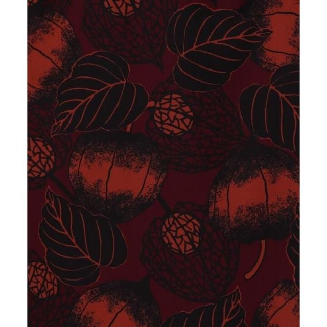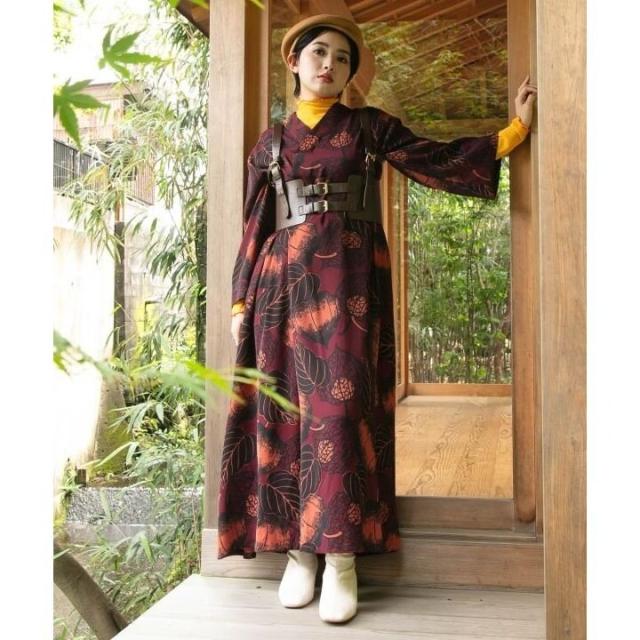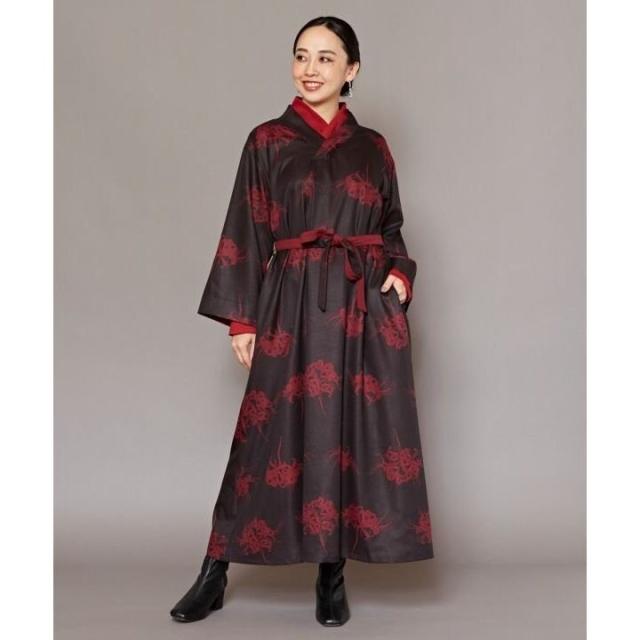 「彼岸花」「鴉(からす)」「鬼灯(ほおずき)」柄を、現代的な色彩で大胆に描いたワンピース。着物風羽織はもちろん、ジャンパー等のカジュアルなジャケットと合わせても、スタイリッシュな和洋折衷の雰囲気が楽しめます。両サイドポケット付き。