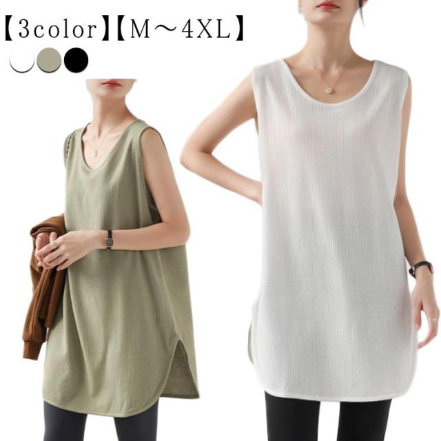 タンクトップ レディース トップス ノースリーブ Uネック ゆったり インナー タンクロング タンク レイヤード 体型カバー スリット ロング丈 透けにくい ラウンド裾 無地 ワッフル生地 チュニック 大きいサイズ 白 黒 シンプル