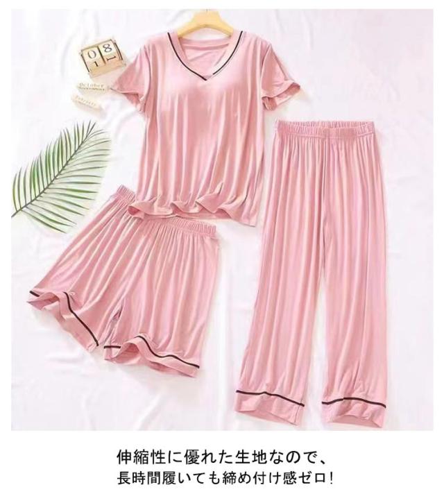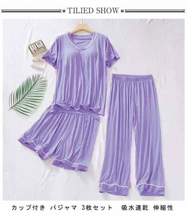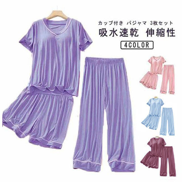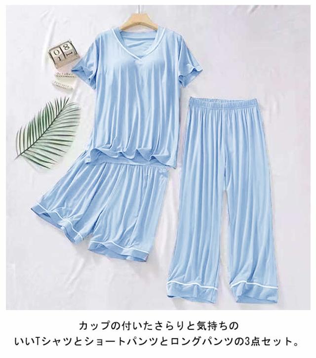 カップ付き パジャマ 3点セット レディース 半袖 ルームウェア 上下 春 夏 秋 Tシャツ ショートパンツ ロングパンツ セットアップ 夏 涼しい 女性用 ゆったり ナイトウェア 部屋着 vネック ストレッチ 吸水 速乾 入院 寝間着 寝巻き 大きいサイズ 送料無料