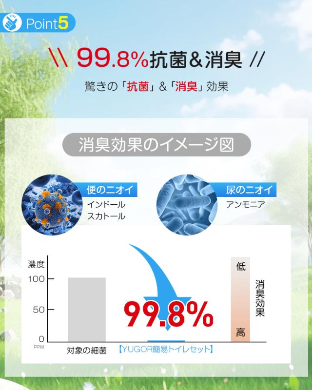吸水力と消臭性を兼ね備えた凝固剤1袋(8g)の使用で2000mlの水も大便もしっかり固め、細菌の増加を抑え、不快なニオイの発生を防ぎます。