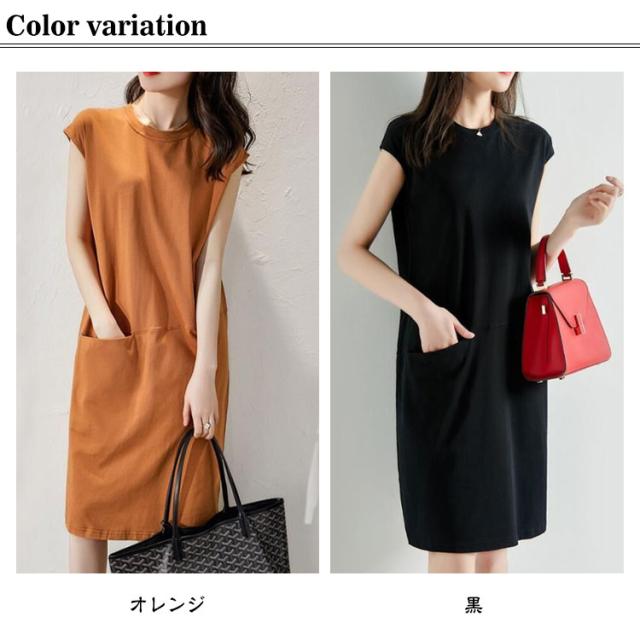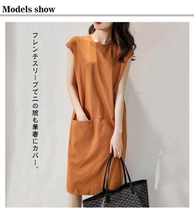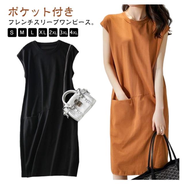 クルーネック 薄手 フレンチスリーブ レディース 夏 40代 膝下丈 ノースリーブワンピース 無地 ポケット付き ワンピース 膝下丈 カジュアル 体型カバー きれいめ ゆったり ロングワンピース フェミニン 大きいサイズ 20代 30代 大人かわいい 50代 通勤 シンプル