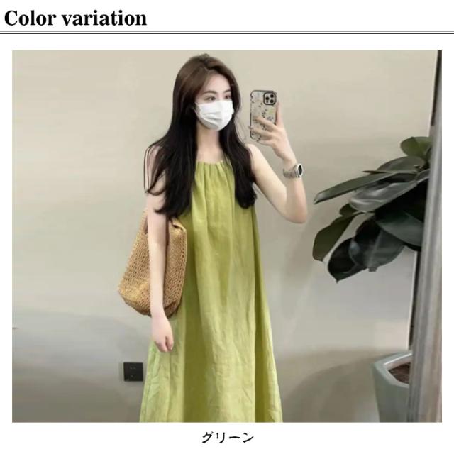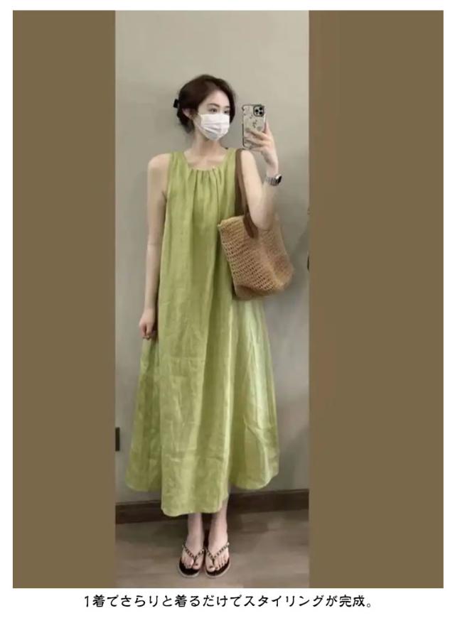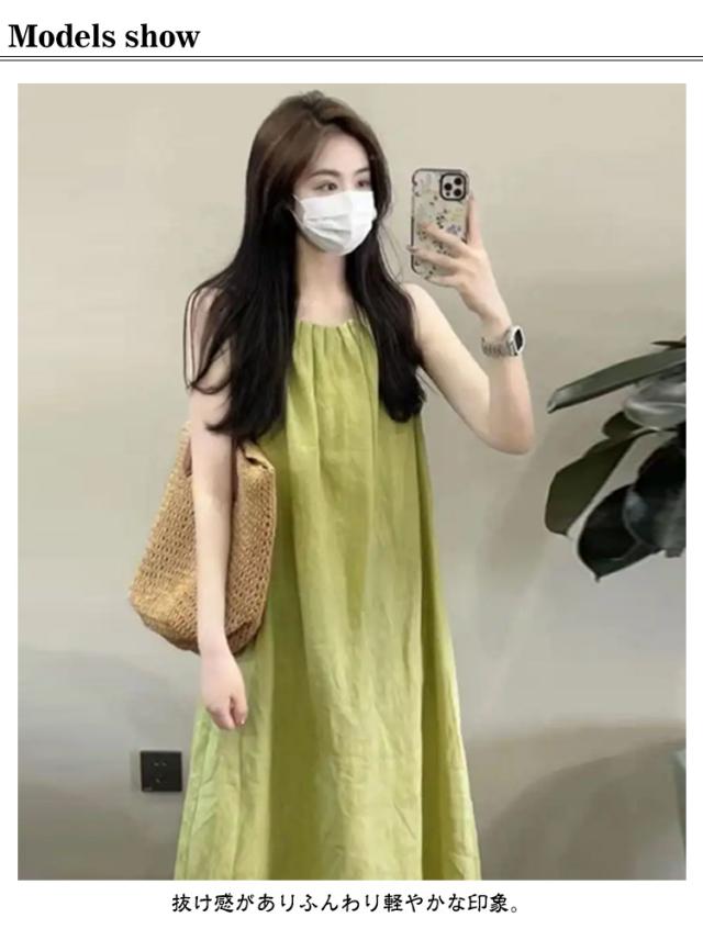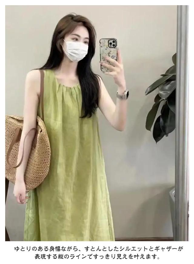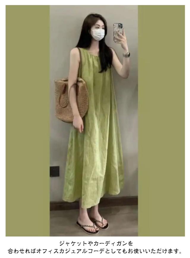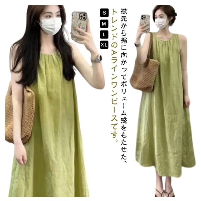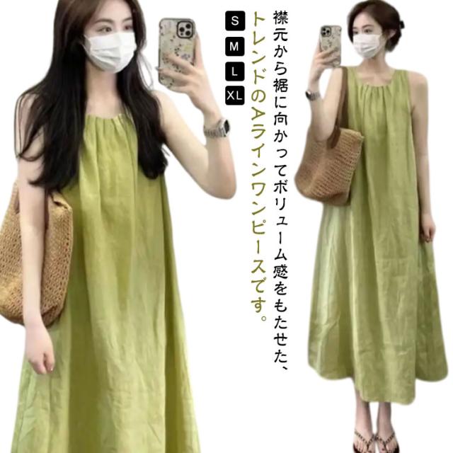 夏 フレア Aライン レディース 通勤 マキシ丈 薄手 ノースリーブワンピース マキシワンピース 緑 タック ロングワンピース 大人可愛い ワンピース ゆったり 体型カバー おしゃれ きれいめ カジュアル 通学 シンプル オフィス 無地 ギャザー グリーン 春