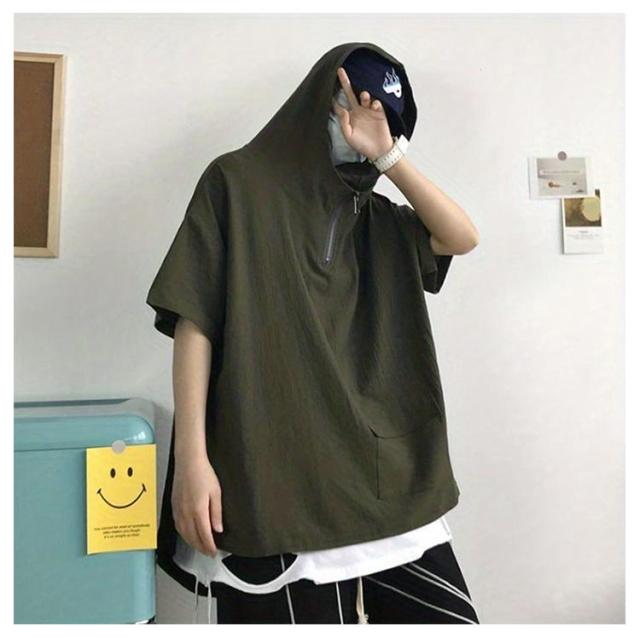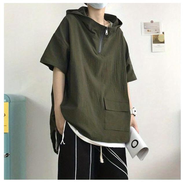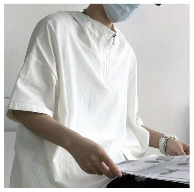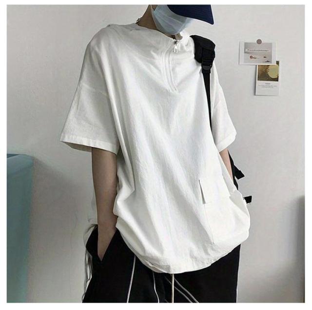 5分袖 半袖tシャツ メンズ メンズ 夏用 ジップ 半袖パーカー 夏 プルオーバー ボリューム ボリュームネック ハイネック 韓国 ビッグシルエット 夏 ゆったり ビッグシルエット 男女兼用 パーカー 夏用 フード付き パーカー 薄手 ビッグパーカー