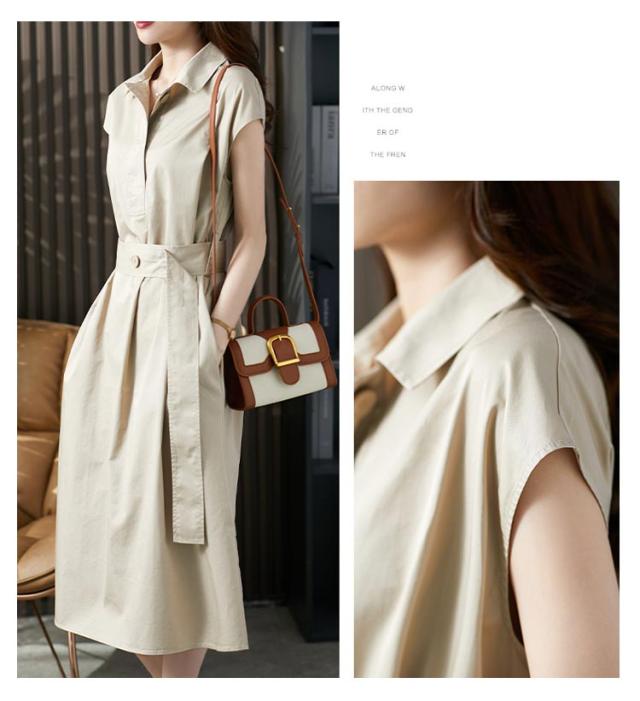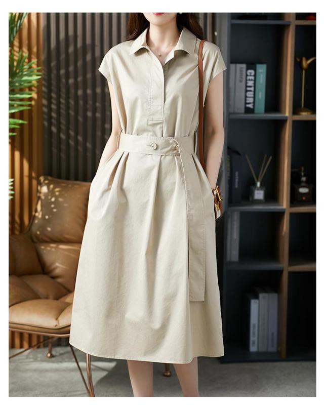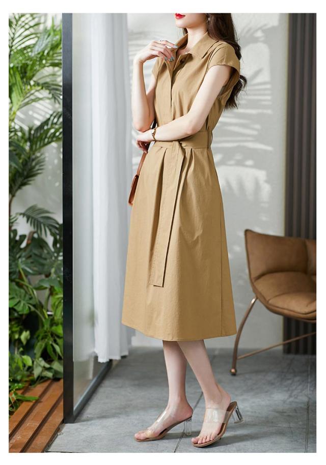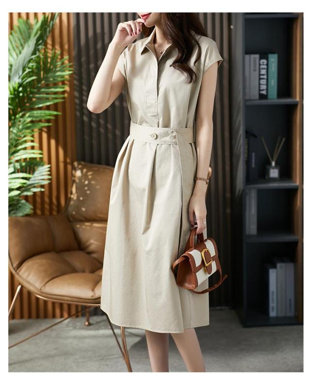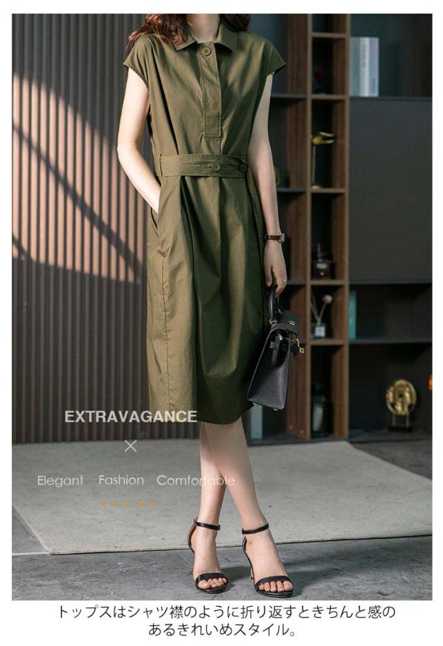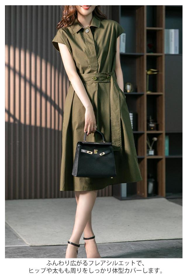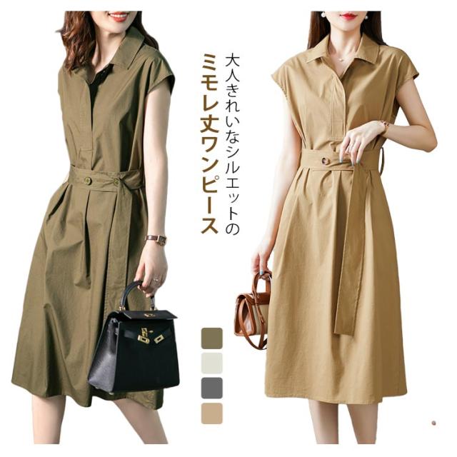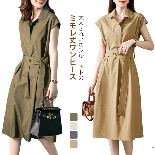 レディース シャツワンピース シャツ襟 ワンピース 夏 ウエストマーク フレンチスリーブ ロングワンピース ミモレワンピース 体型カバー フレアシルエット ウエストベルト 通勤 キレイめ 卒業式 入学式 春 ミモレ丈