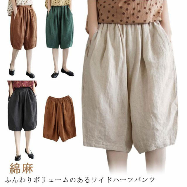 夏 ハーフパンツ 綿麻パンツ ショートパンツ 涼しい 薄手 部屋着 膝丈 レディース 5分丈 ウェスト総ゴム ベージュ ブラック コーヒー グリーン バルーンパンツ リネンパンツ 短パン ガウチョパンツ パンツ ボトムス 半ズボン