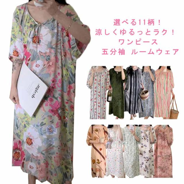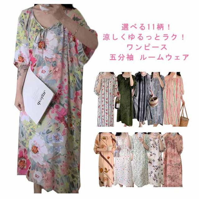 寝間着 五分袖 部屋着 半袖 パジャマ ワンピース 春 ワンピース 薄手 大きいサイズ 可愛い ロング丈 花柄 無地 ロングワンピース ゆったり ルームウェア レディース 寝巻き リラックス 体型カバー おしゃれ Vネック ギフト