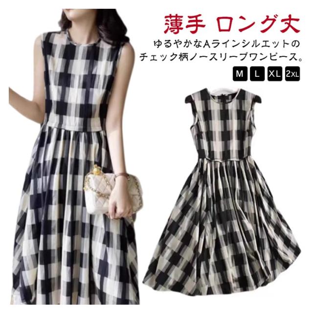 ワンピース レディース 大人かわいい きれいめ 夏 袖なし ロングワンピース チェック柄 フレアワンピース ノースリーブ Aライン 薄手 ロング丈 チェック柄ワンピース ゆったり 体型カバー ノースリーブワンピース おしゃれ