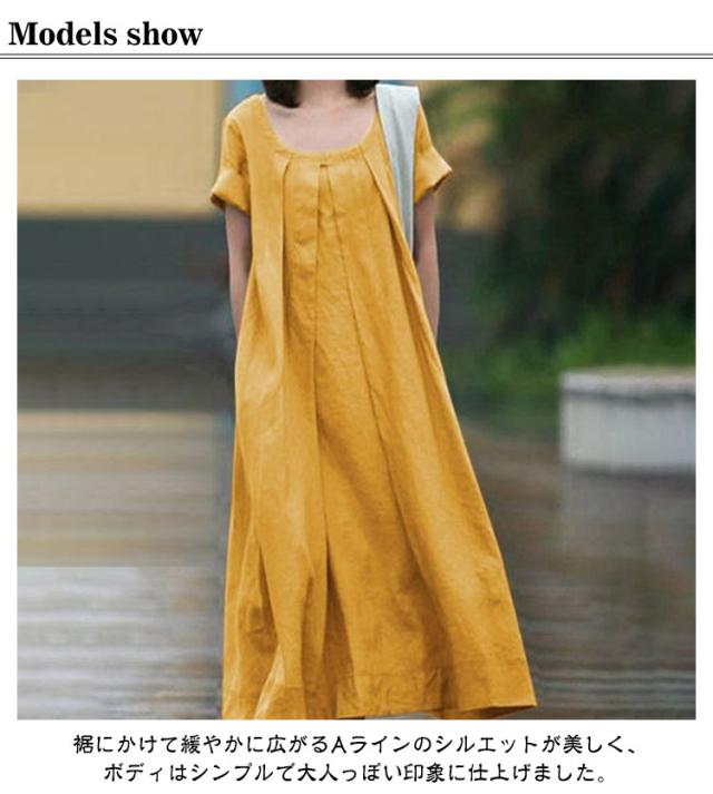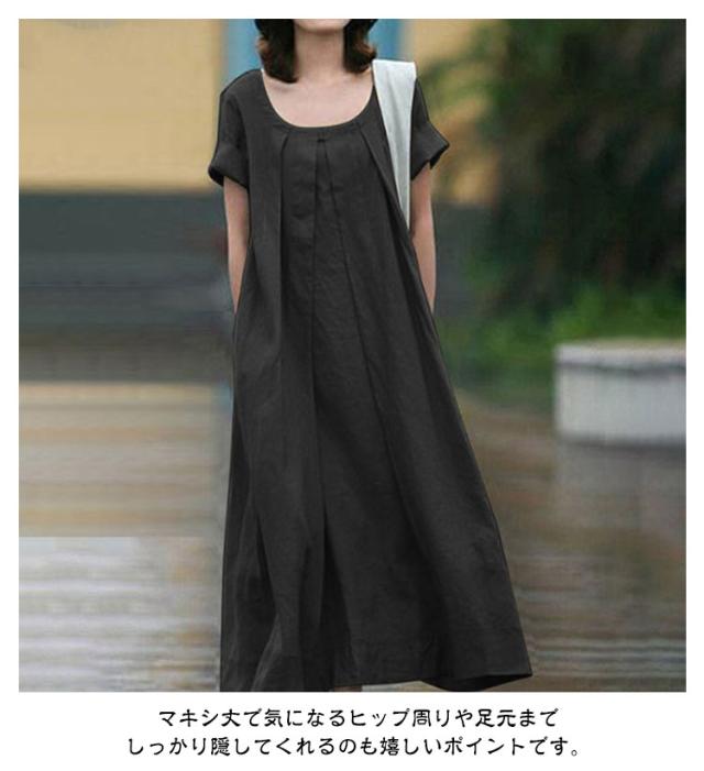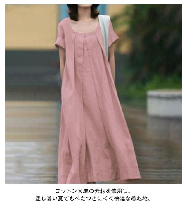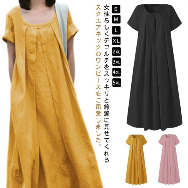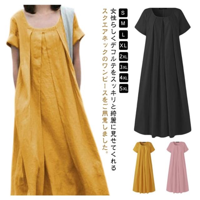 レディース 半袖 半袖 リネンワンピース 大人かわいい 綿麻 ロングワンピース タック入り 夏 シンプル スクエアネック ワンピース 無地 薄手 きれいめ ルームウェア ゆったり 体型カバー おしゃれ カジュアル プリーツ 大きいサイズ 20代 30代 40代 50代