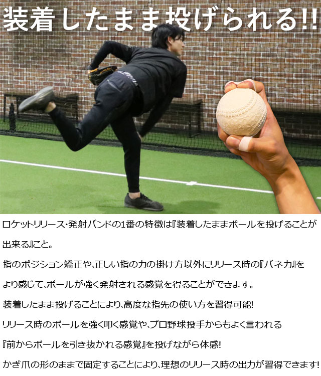 『ロケットリリース・発射バンド』は、野球動作改善専門のプロ施設で生まれた、投球動作中のリリース動作改善のためのアイテムです。