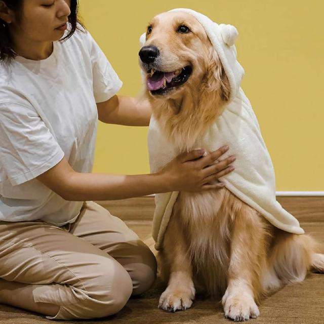 綿の3倍の吸水力・速乾性に優れたマイクロファイバーを使用したペット用ローブです。耳付きフードのデザインがとっても可愛いです。