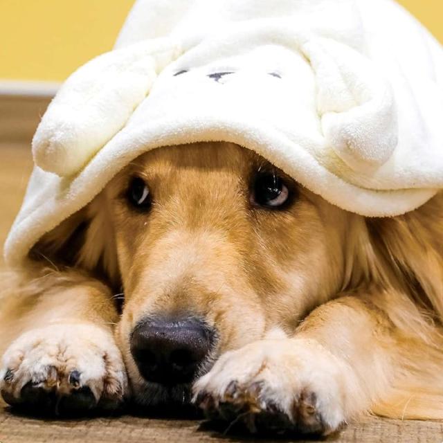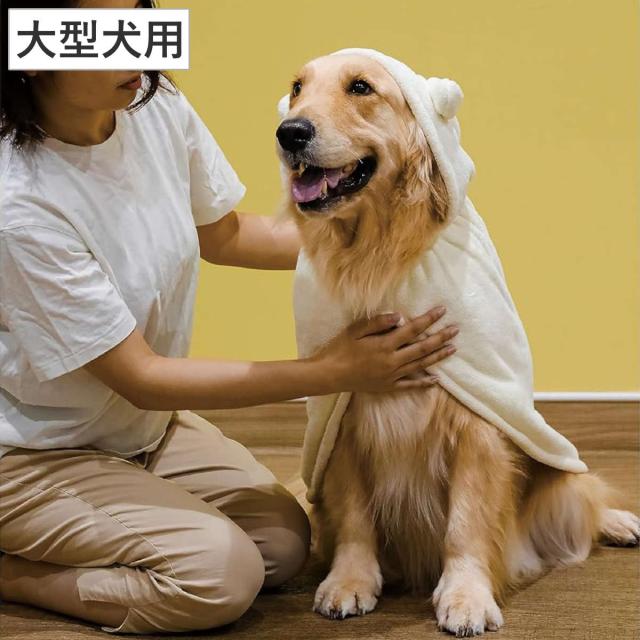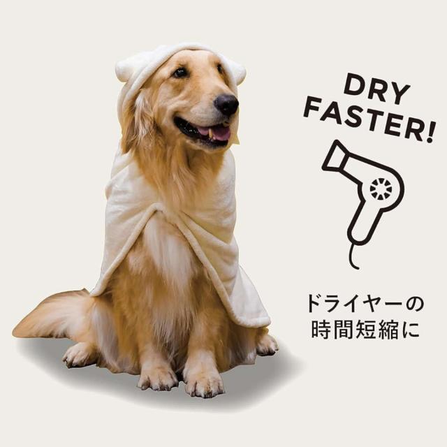 大型犬に対応したビッグサイズです。シャンプー後や、雨の日のお散歩後に被せるだけ。水分を素早く吸収してくれるので、ドライヤー嫌いの子や、体力の低下したシニアペット、寒さが苦手な種類にもおすすめです。マイクロファイバーの隙間には空気が含まれており、保温性が高いので寒い日には、室内防寒ウェアとしても使用できます。