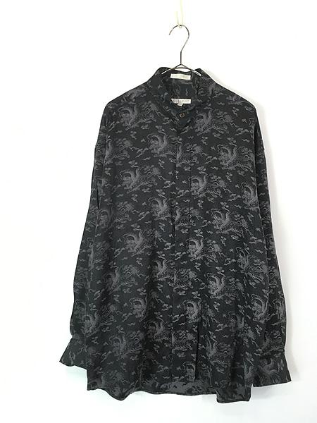 古着 90s ELLIOTT 龍 ドラゴン 刺しゅう 比翼 光沢 レーヨン バンドカラー シャツ グレー L