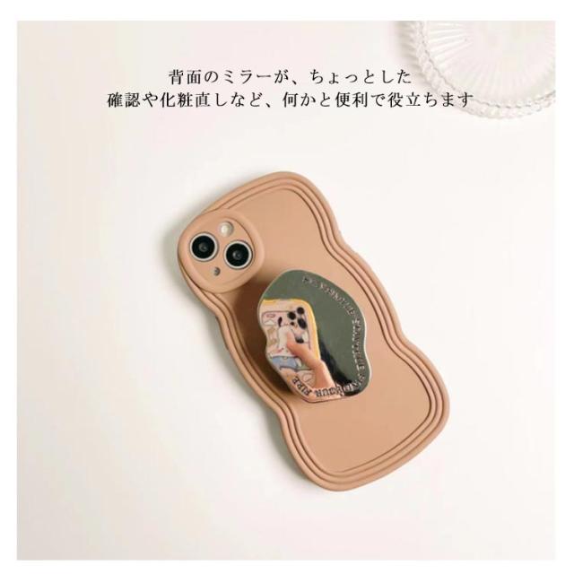 | iPhone15 ケース ミラー付き 背面のミラーが、ちょっとした確認や化粧直しなど、何かと便利で役立ちます 波のフォルムが手にフィットし縦持ち・横持ちでも持ちやすい 背面も本体より丁度いい高めに設計されており、レンズが傷つくのを防ぐことができます | |
