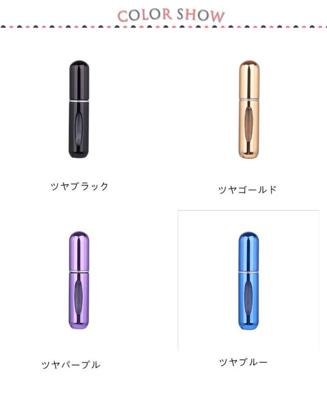 | サイズについての説明 | 【詰め替え方法】容量:5ml STEP1、ご使用前に3-5回プッシュして、排気してください STEP2、香水ボトルのスプレーヘッドとアトマイザ−外殻を外し STEP3、差し込んだアトマイザー本体を上下に押して、 漏れないように最大限4/5を目安に補充してください 【ご注意】元の香水のノズルサイズ:1.香水キャップが取り外せるもの;2.香水のノズルの直径が2-5mm範囲内であるまの、長さの範囲が4mm以上;香水のノズルのタイプについて:直/円柱状は詰め替えできます;使用出来ない対象:香水のキャップが取り外せるないものとノズルが太いもの(5mm以上);ホーン状/きのこ状/傘状など、詰め替えができません。 |