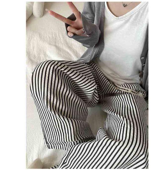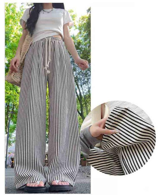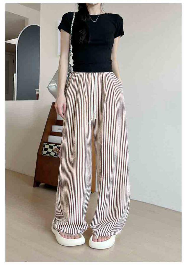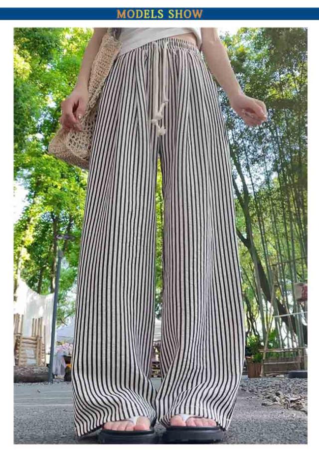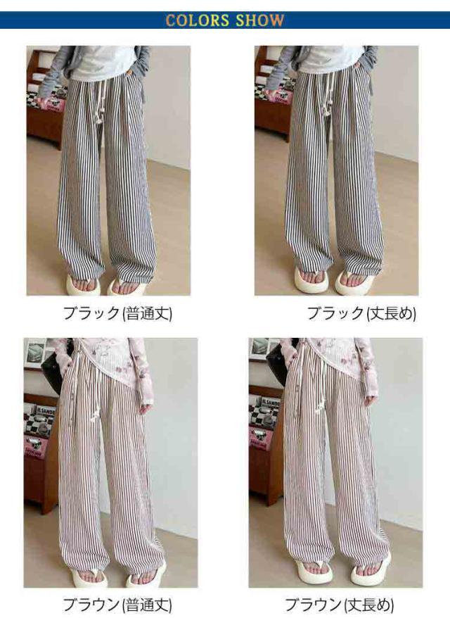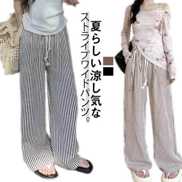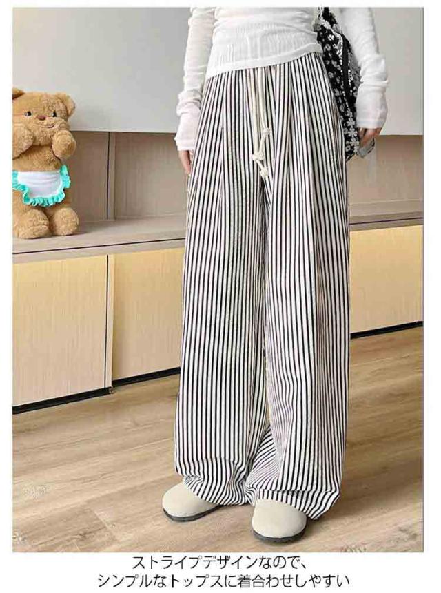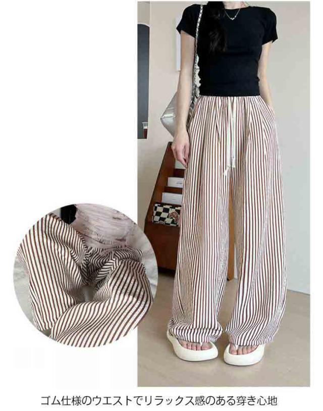 ストライプパンツ レディース ワイドパンツ ボトムス ワイド 春 夏 ゆったり ロングパンツ カジュアルパンツ 体型カバー ストライプ柄 ウエストゴム 落ち感 ボトムス 大人可愛い 部屋着 通勤 きれいめ 送料無料