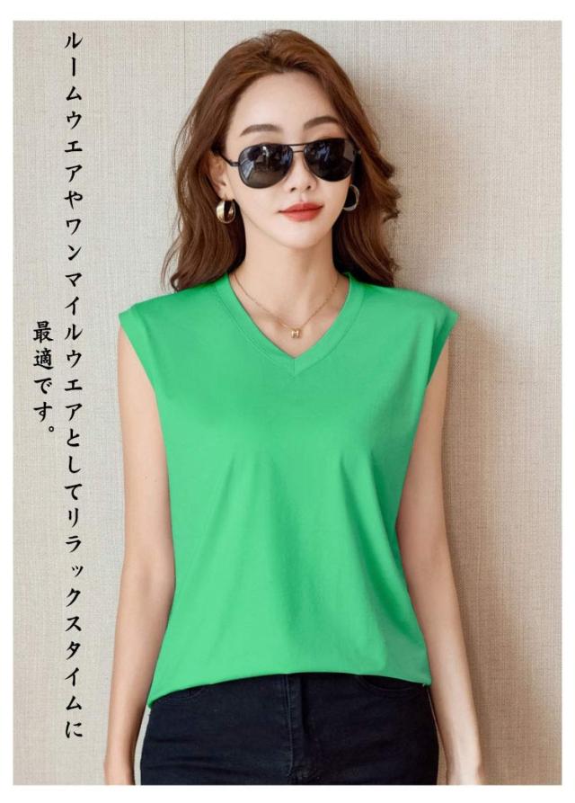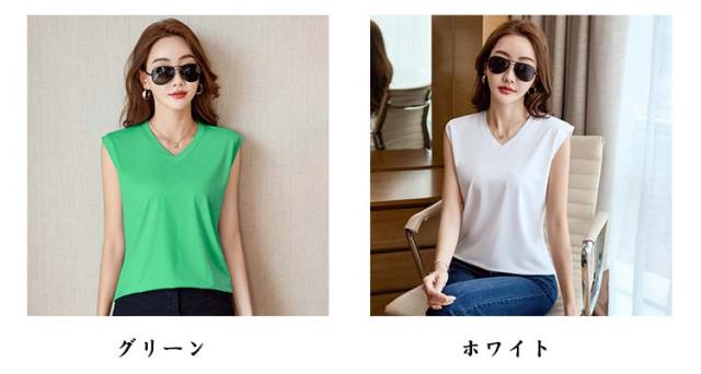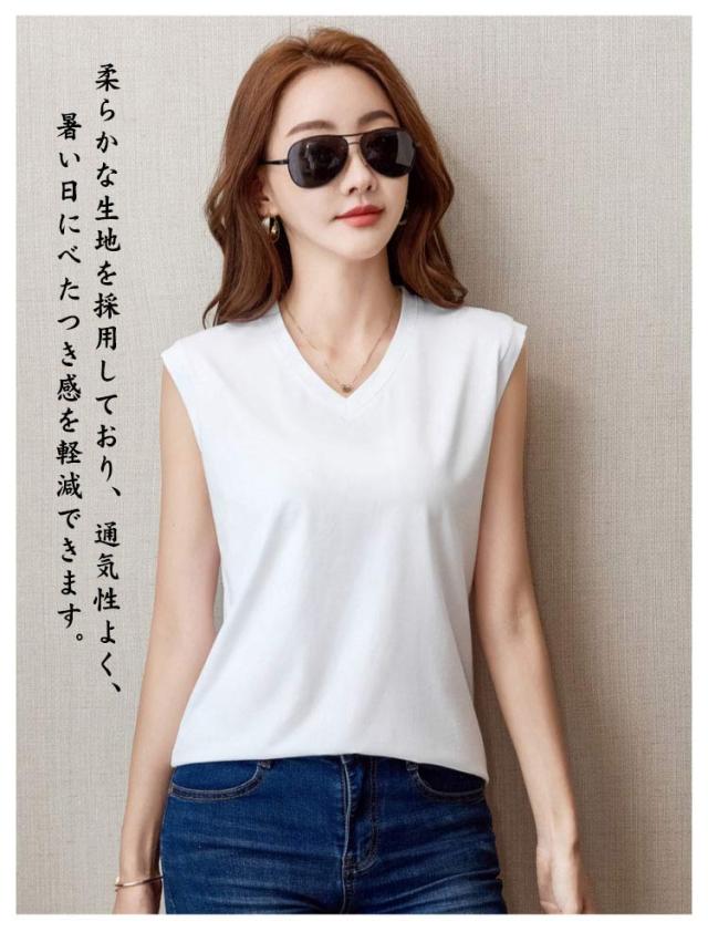 Vネック トップス 無地 Vネック カットソー ノースリーブ タンクトップ 体型カバー ゆったり 袖なし インナー 無地 ティーシャツ Tシャツ カジュアル プルオーバー レイヤード風 レディース